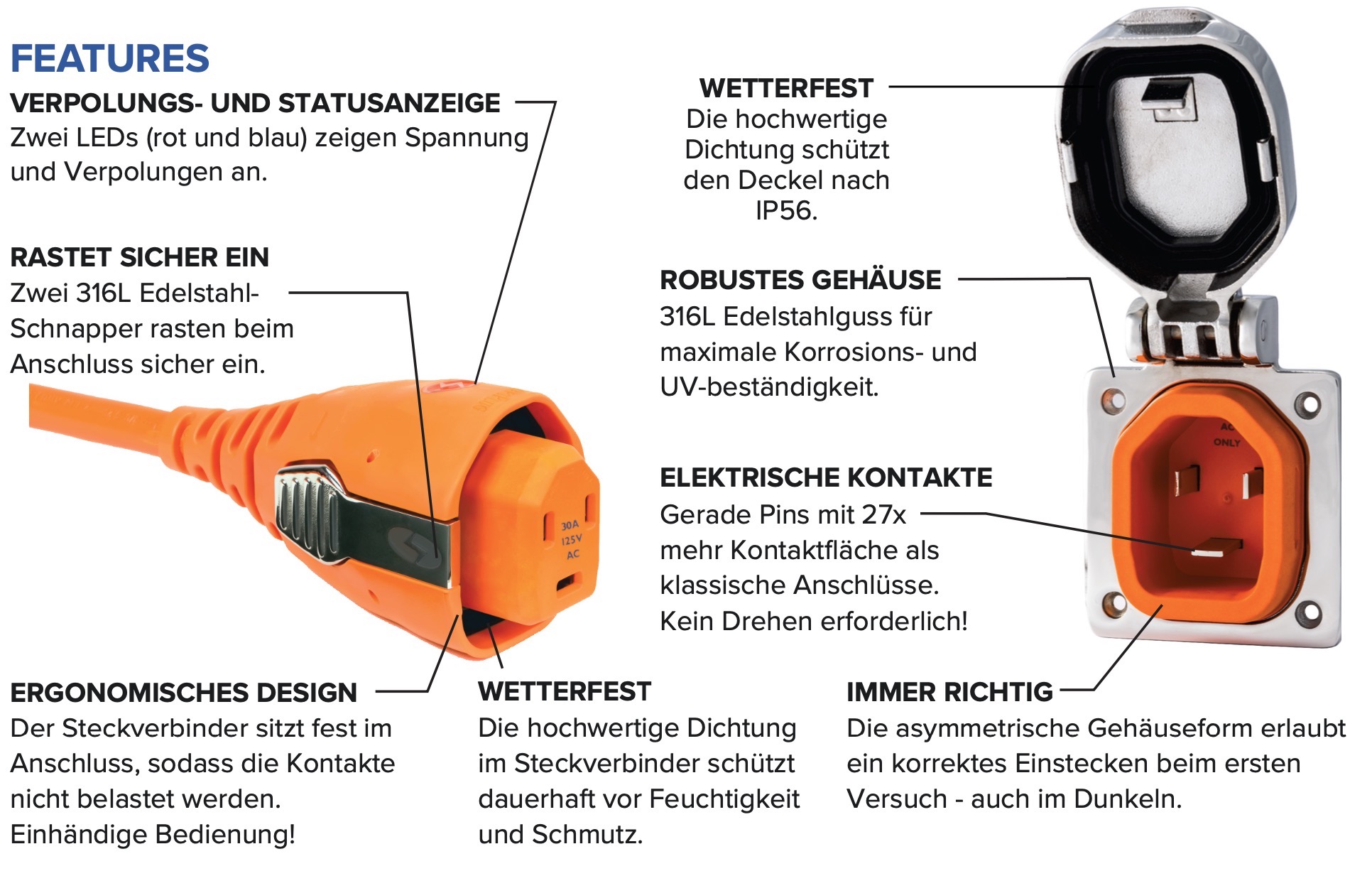 - Edelstahl-Kontakte: 20x größere Kontaktfläche als Drehverriegelungen.