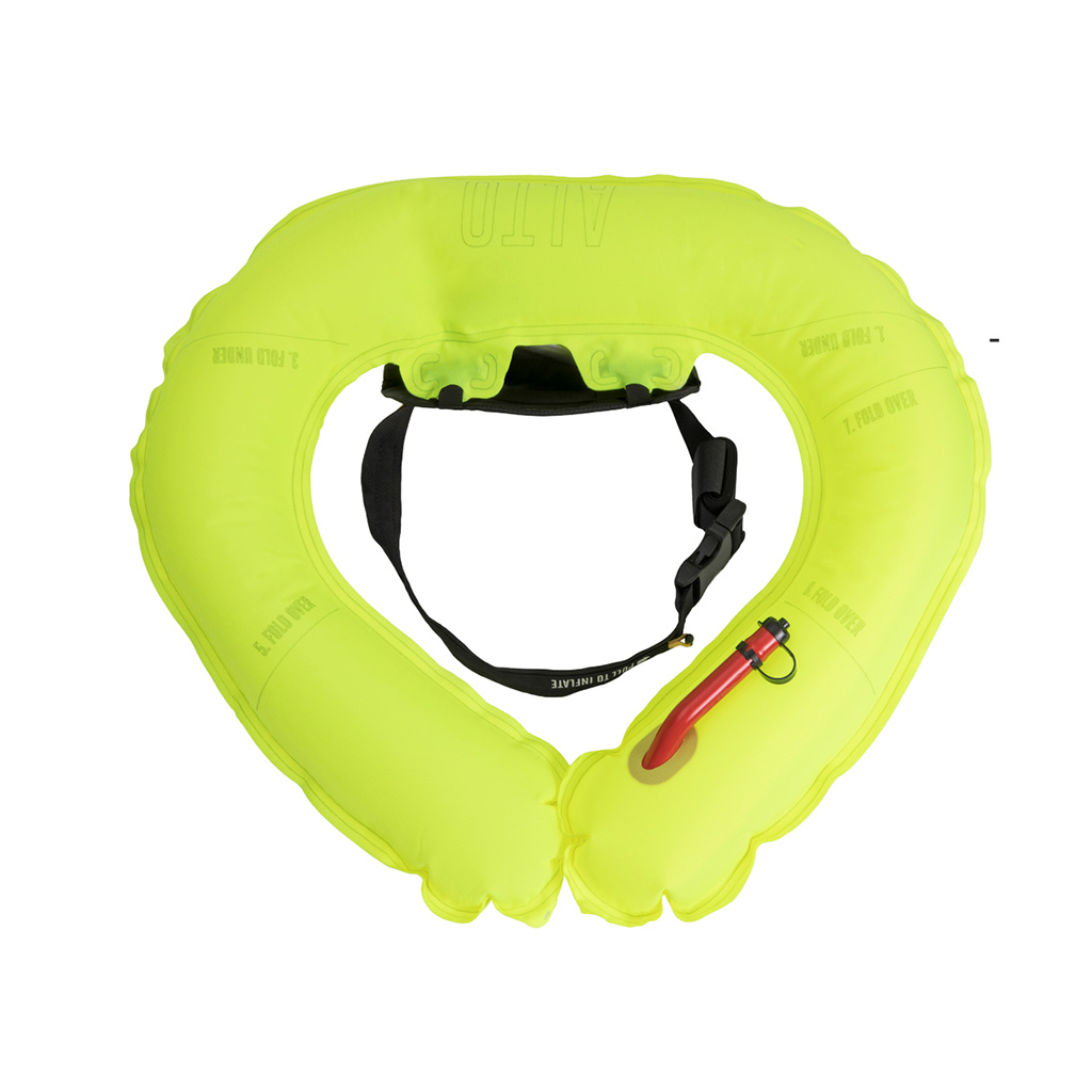 Im Notfall wird die kompakte Blase durch Ziehen an der Auslösung aktiviert und entfaltet sich in eine hufeisenförmige Form, die mit den Armen umschlossen werden kann – für effektive Unterstützung im Wasser. Die Tasche mit der Auftriebsblase kann individuell am Rücken oder Bauch getragen werden, je nach Aktivität oder persönlicher Vorliebe.