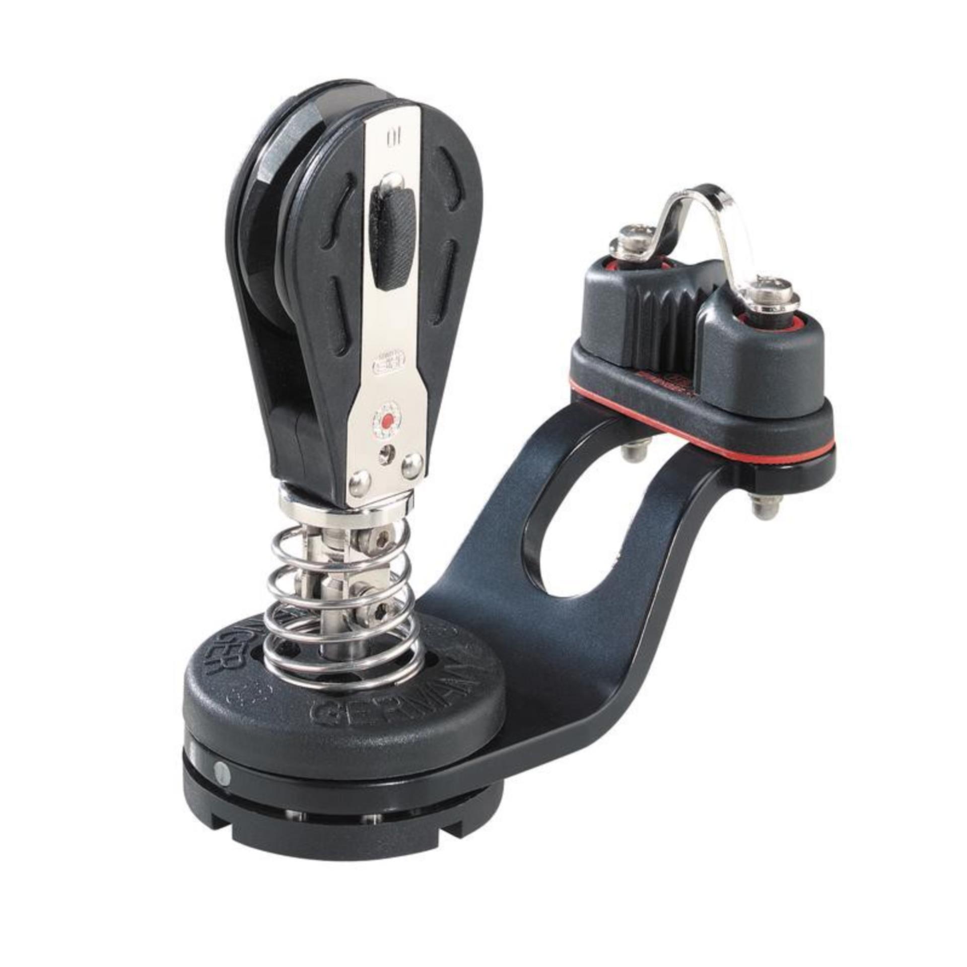 Flexible Kugellager-Basis mit kurzem Ausleger und montiertem Ratschblock für maximal 10 mm Tauwerk, wahlweise um 180°, 210°oder 360°drehbar.