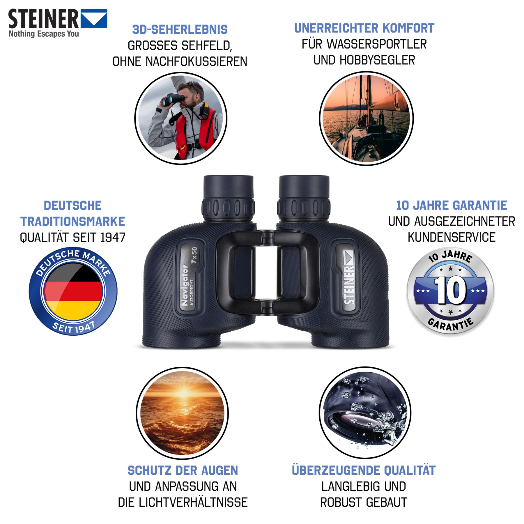 Wie von Steiner gewohnt, überzeugt das Fernglas mit seiner Widerstandsfähigkeit, Wasserdichtigkeit und Präzision – perfekt für den Einsatz auf Segel- und Motorbooten, bei Navigation oder Naturbeobachtung.