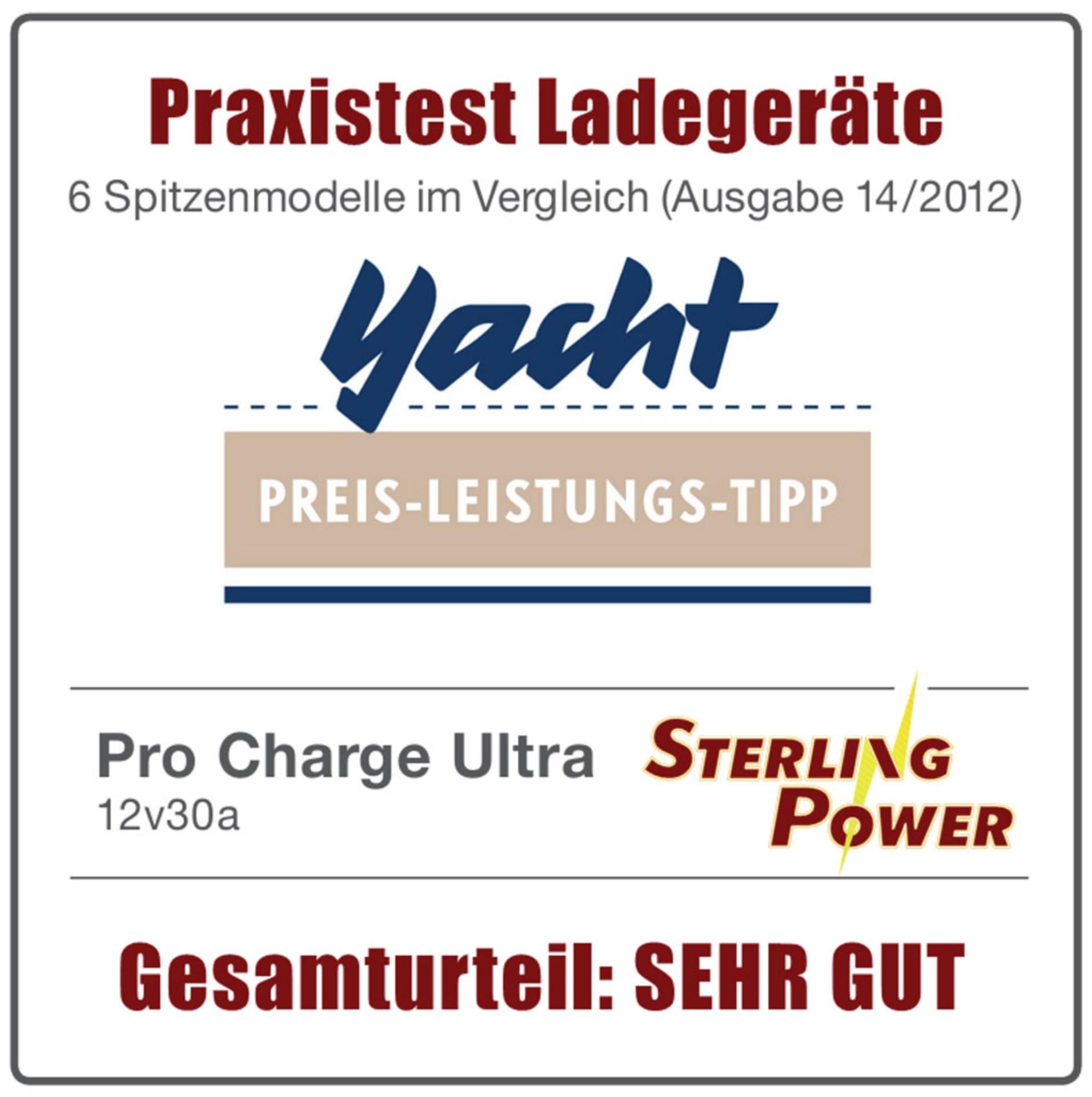 Der "Testsieger". Für die Ausgabe 1/2017 der Zeitschrift YACHT wurden 7 Batterieladegeräte namhafter Hersteller getestet. Als einziges dieser Ladegeräte hat das Pro Charge Ultra von Sterling das Urteil „Sehr gut“ erhalten und wurde als Testsieger ausgezeichnet! Das Pro Charge Ultra erfüllt höchste Standards und ist ein robustes und sicheres Ladegerät (dank prozessorgesteuerter Ladungsüberwachung).