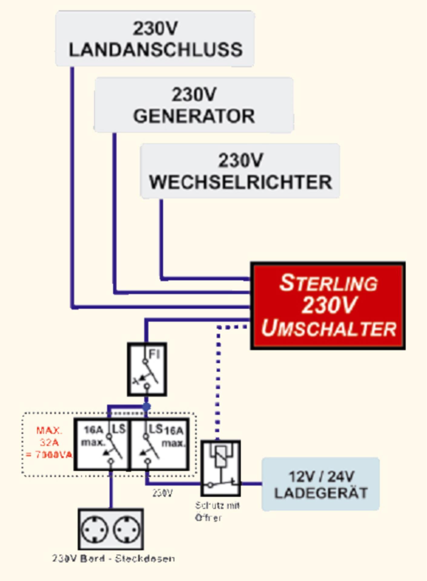 - ✔ Priorisiert – Landstrom vor Generator und Wechselrichter