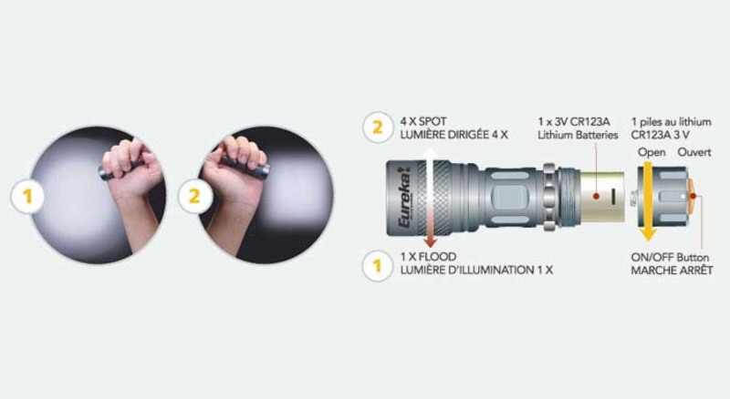 - Geringer Strahl, 4. Stroboskop-Modus, 5. SOS-Licht-Modus