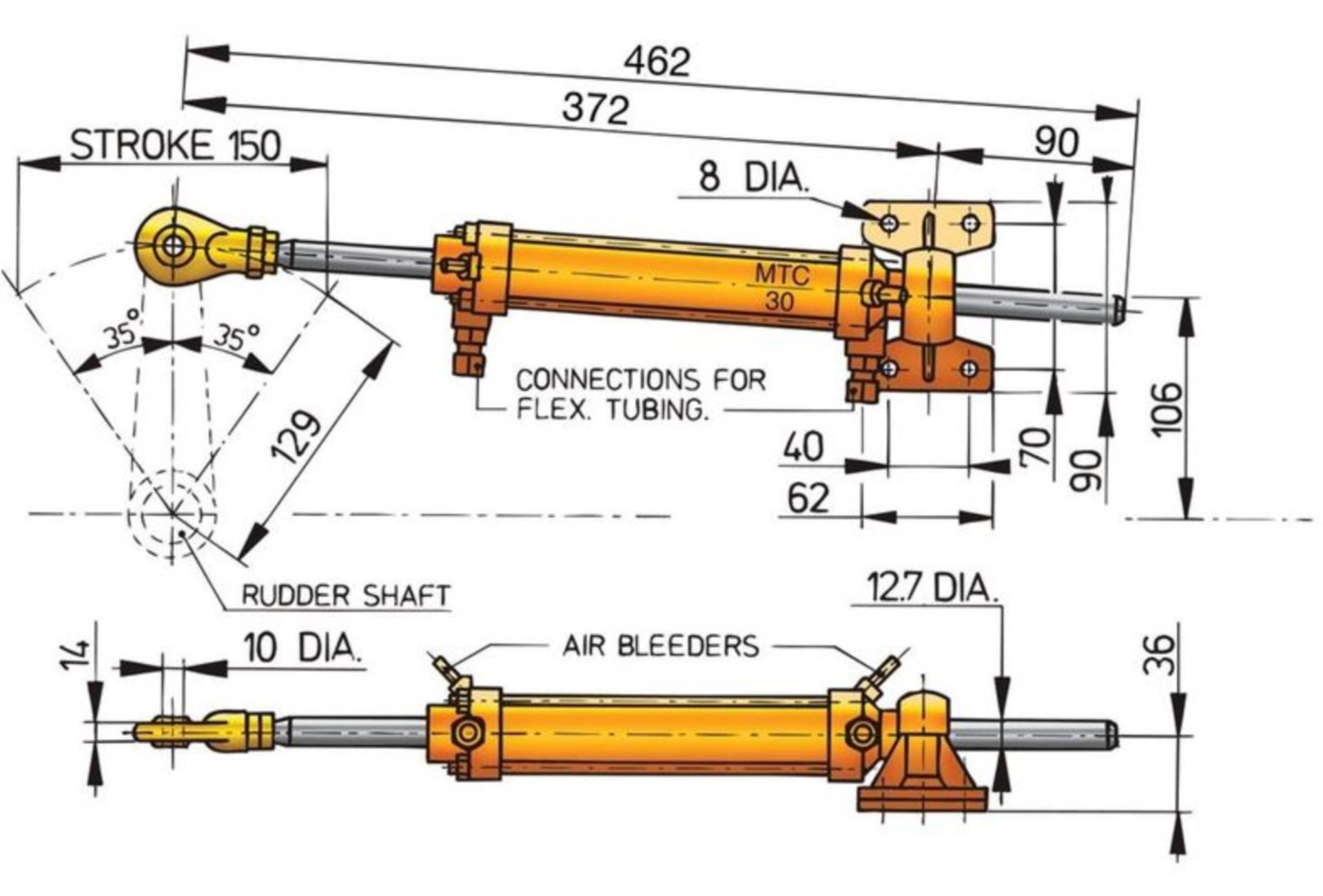 Die Wahl des richtigen Steuerzylinders hängt vom Ruderdrehmoment ab, das durch die Fläche des Ruders, die Bootsgeschwindigkeit und den Ruderwinkel (normalerweise 35° nach beiden Seiten) bestimmt wird. Faktoren wie Motorleistung und Bootslänge sind nicht relevant.