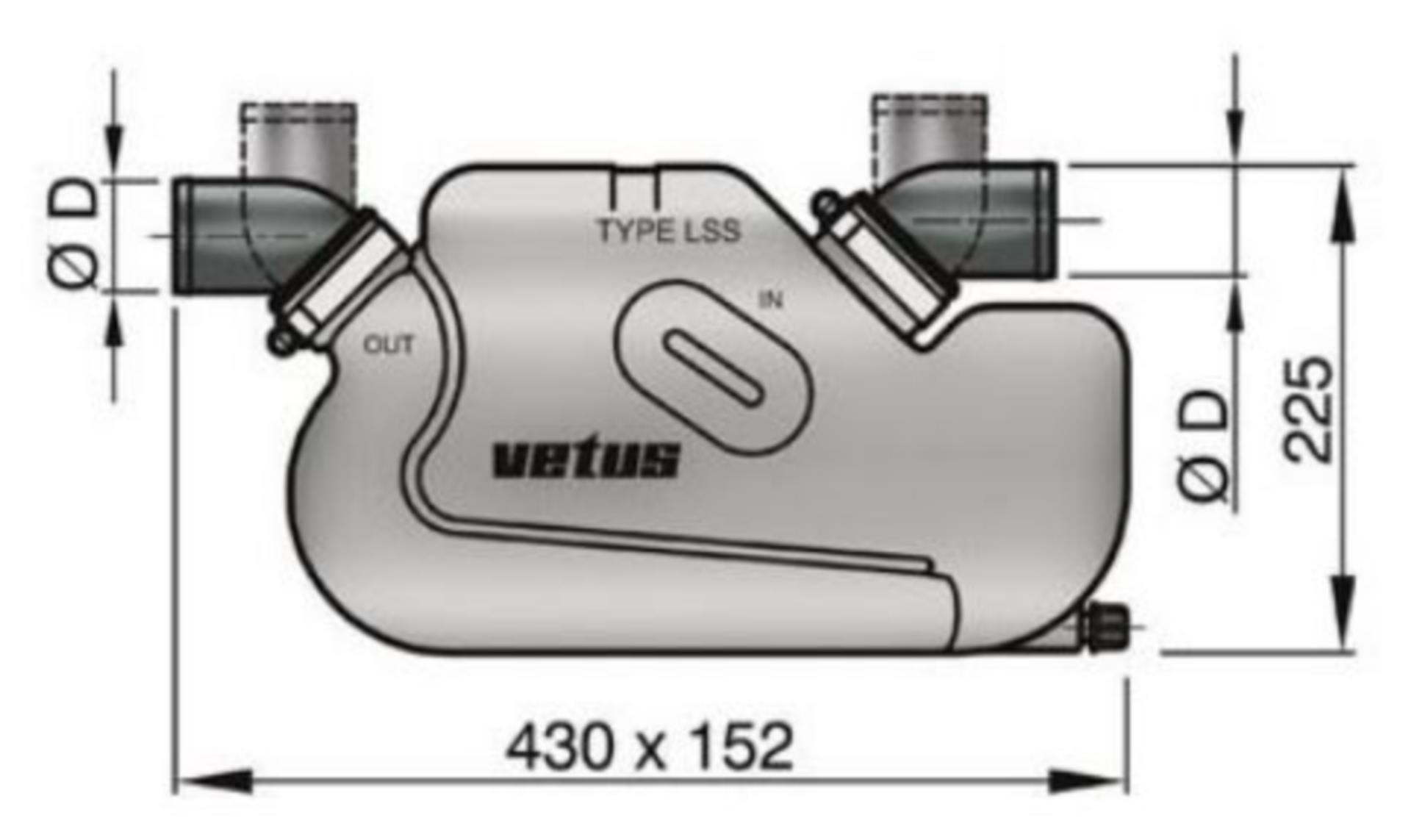 Die Schlauchanschlüsse (Ein-/Ausgang) sind um 360° drehbar. Die Teile der Vetus-Auspuffsysteme eignen sich ausschließlich für die Verwendung in wassereingespritzten Auspuffsystemen.