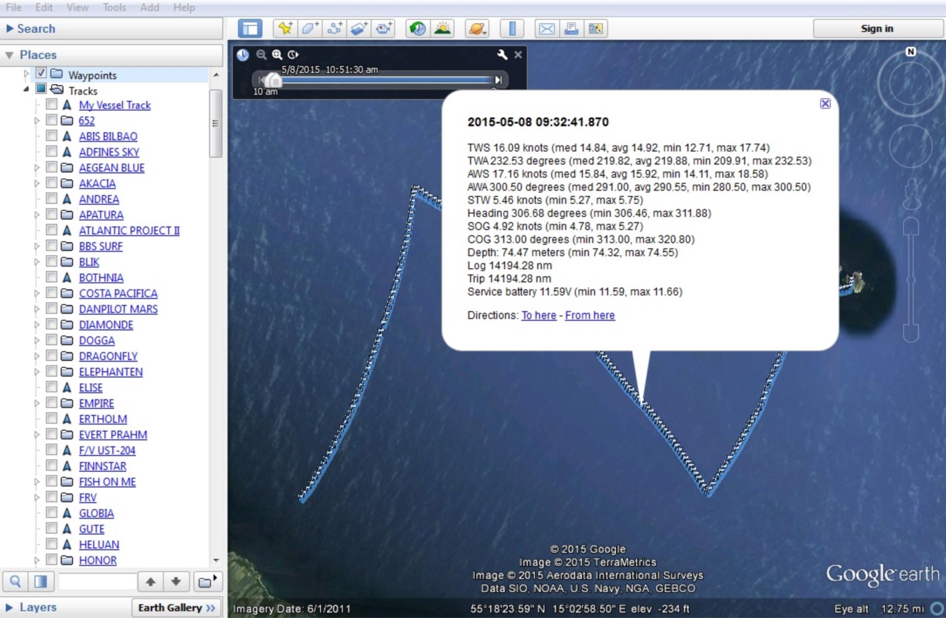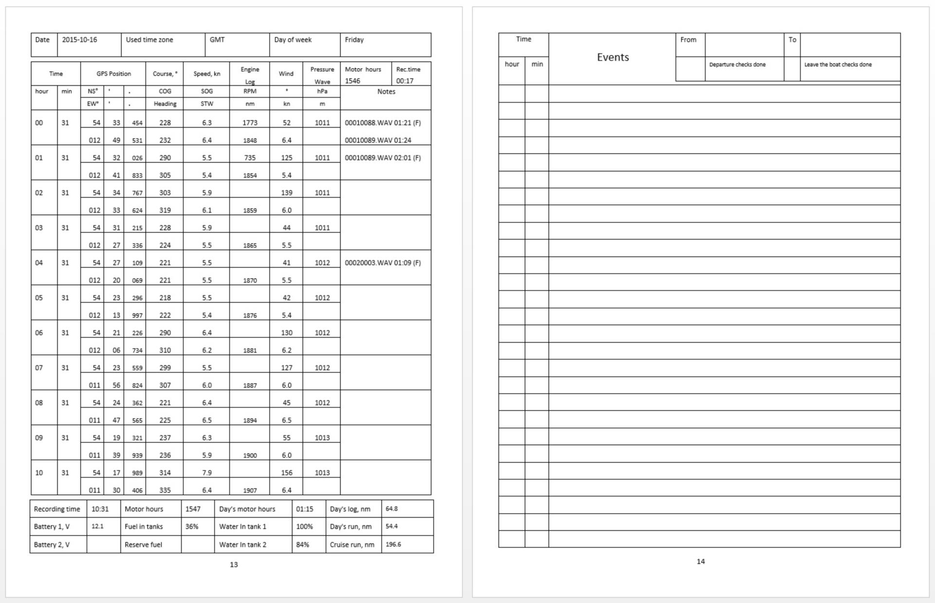 - Formatunterstützung: GPX-Dateien (Google Earth, Garmin MapSource und MFD-Anzeige kompatibel) XML, CAN, OpenSkipper, CanBoat und Signal K CSV für Tabellen und grafische Analysen ODF-Logbuchdateien für eine druckbare Version