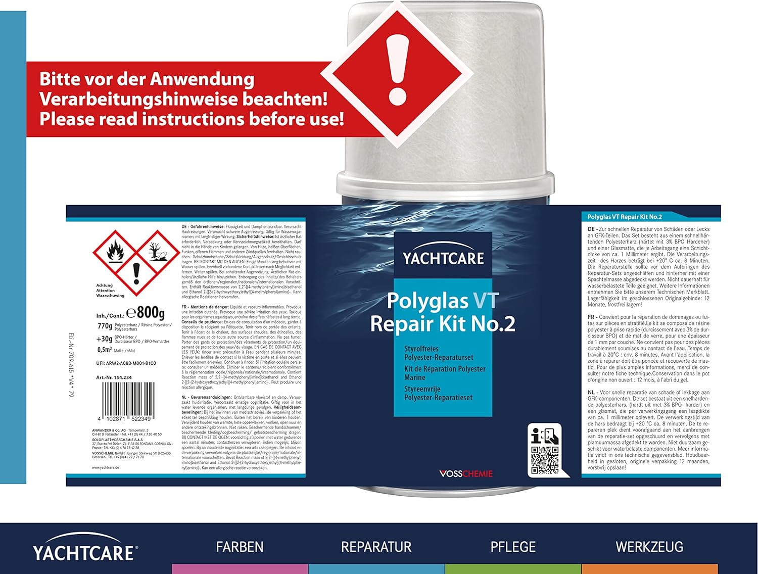 POLYGLAS REPAIR KIT VT enthält ein styrolfreis, schnellhärtendes und aminbeschleunigtes Polyesterharz, welches in Verbindung mit der Glasmatte speziell für schnelle Reparaturen an GFK-Teilen eingesetzt wird. Das Set enthält neben dem Polyesterharz die entsprechende Menge BPO-Härterpaste und Glasfasermatte. POLYGLAS REPAIR KIT VT eignet sich sehr gut für eine Not-Reparatur, da das Boot bereits nach ca.1 Stunde wieder vorsichtig in Betrieb genommen werden kann.
