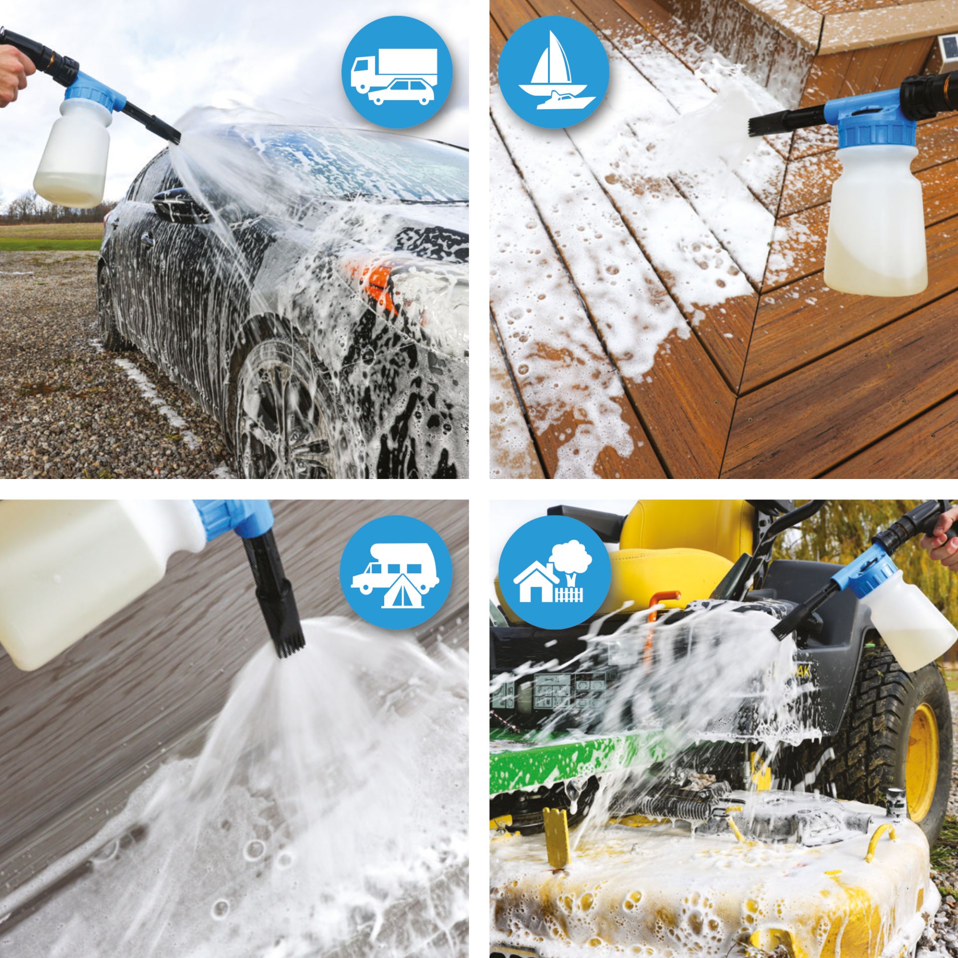 Ein besonderes Highlight ist das verstellbare Sprühmuster, das wahlweise vertikal oder horizontal eingestellt werden kann. Dadurch lässt sich die Schaumbildung optimal an verschiedene Oberflächen anpassen – von großen Rumpfflächen über Aufbauten bis hin zu breiten Deckbereichen. Auch bei Fahrzeugen oder Hausfassaden sorgt der Sprühstrahl für eine effiziente und gleichmäßige Schaumschicht.