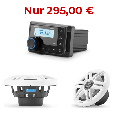 Dieses Set liefert kraftvollen, klaren Sound selbst unter anspruchsvollen Bedingungen auf See. Ob beim Cruisen, Segeln oder Entspannen im Hafen – das Clarion-System sorgt für Entertainment auf höchstem Niveau - nur jetzt zum Winter-Sparpreis bei Gründl!